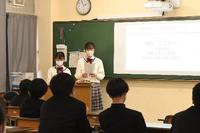 12月16日(金)4限、全校生徒を対象に(3年生は教室でリモート視聴)、人と環境類型生徒による「共生について考える」発表会を行いました。1年生から3年生まで人と環境類型生徒の代表が、全校生徒の前で授業で学んだ内容や感想を、スライドを使って発表しました。