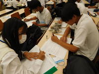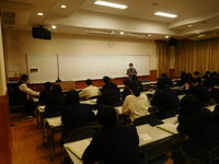 JICA自体の説明の後、青年海外協力隊に理学療法士として参加し、ラオスへ赴任された方の話を聞きました。ラオスという国や食べ物などの一般的な説明の後、日本での語学研修を終えて現地の病院で業務に携わったときの体験談など、たくさんの写真を交えた大変興味深い講義でした。現地で困ったことや、やっておいてよかったこと、日本での常識が通用しなかったことなど、体験されたからこそわかるお話が多く、生徒たちの心にも響いたようです。