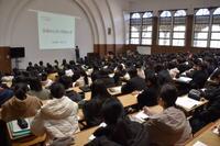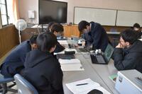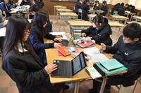 高校の教室で、大学の先生と約20人の聴衆の前に立ち、研究発表を行いました。
