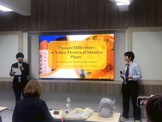 午後、いよいよポスターセッションです。タイの38校、日本の37校から高校生が集まり、合計176本の研究発表が行われました。本校からは、科学部生物班の研究「Pigment Differnces in Yellow Flowers of Invasive Plants: Toward Upcycled Crayon and Dye Products」を発表します。英語があまり得意でない2人ですが、一生懸命練習してきましました。提携校であるチェンライ校の先生も応援に来てくださいました(左下の写真)。