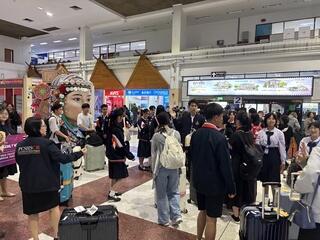 約1時間半のフライトでチェンライ国際空港に到着しました。空港には、プリンセスチュラボーンサイエンスハイスクール・チェンライ校の先生、バディとなる生徒のみなさんが迎えにきてくださっていました。ジャスミンで作られたレイや軽食も用意されており、その温かなおもてなしに一同感激しました。