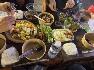 右下の写真は、私たち教員の夕食です。チェンライ校の先生方おすすめのローカルフードをいただきました。