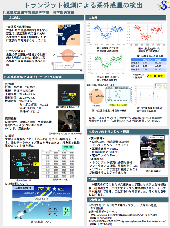 地域のアマチュア天文クラブ「さんだ天文クラブ」の協力の下,太陽の黒点活動の観察や天体観測などを中心に活動している。また年2回,三田市こうみん未来塾で太陽観測を実施,宇宙開発や天文現象,人間生活と天文学の関係などについて,地域の小・中学生と学び,天文活動の普及や地域の科学教育の推進に協力している。研究活動も積極的に取り組んでおり、令和7年度の兵庫県高等学校総合文化祭自然科学部門発表会では、地学分野で「口頭発表優秀賞」「ポスター発表優秀賞」を受賞している。