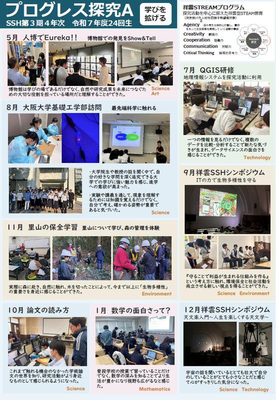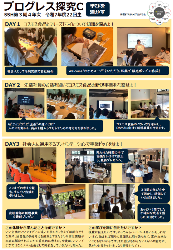 「イノベーションを起こし、新しい社会を切り拓くグローバルリーダー育成する」ことを目的とし、STEAM教育を取り入れた発展的なプログラムとして、3年次生対象の集大成として「プログレス探究C」を開講した。「学びを活かす」ことをテーマに、三田市のフリーズドライを扱う企業である「コスモス食品」の協力のもと、マーケティングに関する実習および成果発表を行った。