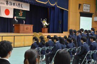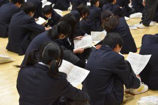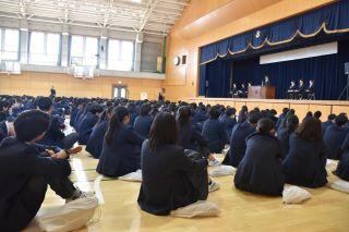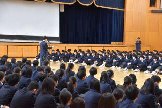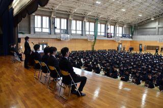 高校の教室で、大学の先生と約20人の聴衆の前に立ち、研究発表を行いました。