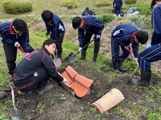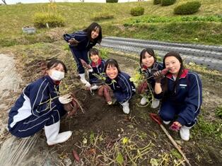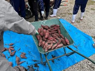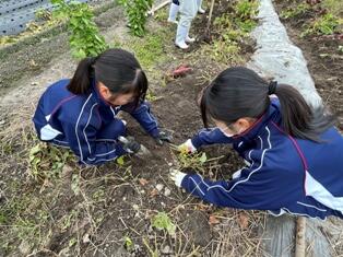 今日は、上野ヶ原特別支援学校の生徒さんと一緒にサツマイモのイモ掘りを行いました。1か月前にも交流していたこともあり、再会するとすぐに声をかけ合い、和やかな雰囲気で作業が進みました。本校の生徒は先週、イモの掘り方を学び、ツルを取り払う準備もしていたため、スムーズに収穫できました。大きなサツマイモが出てくるたびに、一緒に喜ぶ姿が印象的でした。