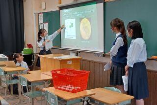 マルシェと並行して、生物探索アプリ「バイオーム」の体験会も実施しました。株式会社バイオームの中藤さんからアプリの使い方について説明していただいた後、科学部の生徒による案内のもと、生物を観察しながら校内を歩きました。とはいえ、昆虫などの動物はその場ですぐに見つけるのは難しいもの。そこで、科学部生物班は2日前から校内でさまざまな生きものを採集し、ケースに入れて通路沿いに並べておく工夫をしてくれました。参加者は、それらの生きものをスマートフォンで撮影し、アプリを使って名前を調べる体験を楽しみました。