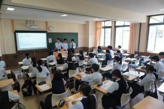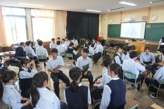 1限目は人権ホームルームの時間で、「多文化共生社会」について考えました。今年の9月には校外学習で万博への訪問が予定されています。万博ではさまざまな国のパビリオンを見学でき、多くの外国の方々ともふれ合える機会があります。また、私たちの身近にも多くの外国の方が暮らしており、そうした地域で起こりうる課題や問題点についても話し合いました。