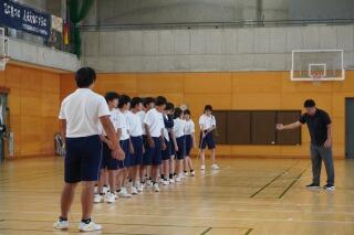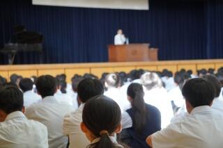 次は生徒指導部長の岸先生からのお話。熱中症への注意、特殊詐欺(トクリュウ)への警戒、交通安全、公共の場でのルールやマナーについての内容でした。また、笑顔で挨拶できていた生徒や、規律を守って活動していた部活動に対して、表彰が行われました。