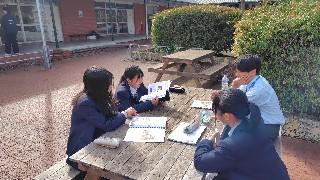 といった内容をまずは話し合い、その後英文でまとめました。話し合いは教室の中だけでなく、外で行ってもかまいません。
