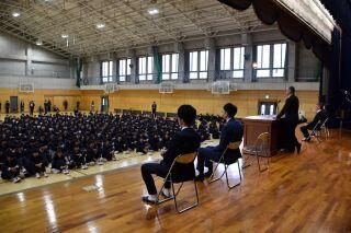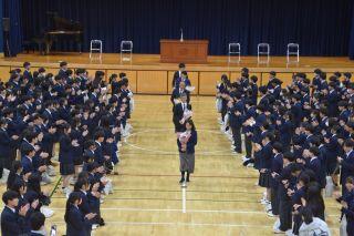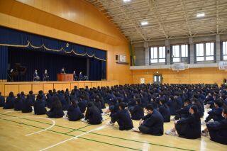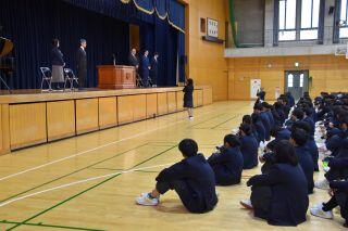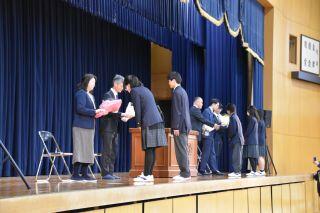 明日の卒業式に先立って、表彰式、記念品贈呈式、同窓会入会式がありました。
