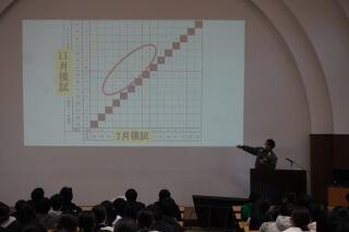 また、「11月模試」の結果も返ってきました。24回生全体として成績が上がった人が多く、よく頑張ったと思います。成績の上昇率は兵庫県下でもトップクラスだったそうです。一方で、24回生の課題である「計画性」と「振り返りの甘さ」についても指摘がありました。そこで新たに「First One Mile」という取り組みが紹介されました。ぜひ上手に活用してください。