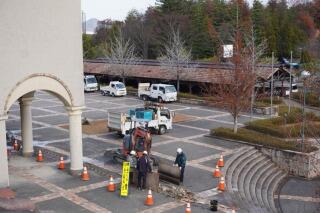 食堂前のタイル工事が始まりました。一部分だけですが、カラーアスファルトに張り替えられるそうです。綺麗な祥雲館を維持していくための工事ですね。