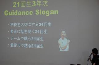 次に宮浦先生からの話です。21回生のガイダンススローガンとして「学校を大切にする21回生」「素直に話を聞く21回生」「チームで戦う21回生」「最後まで粘る21回生」を掲げました。どれも大切な内容です。ぜひ実行してくださいね。