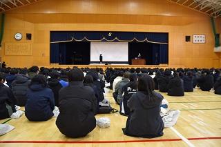 3年次生が自宅学習に入り、1・2年次生のみの全校集会になりました。