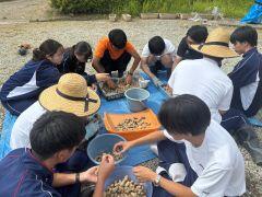シンポジウムの開催に合わせて、ミニマルシェも実施しました。この日の販売を目標に、プログレス探究A選択者の有志が、6月から里山農園で落花生の栽培に取り組んできました。当日は、朝9時に集合し、まずは落花生の収穫からスタート。収穫後は試食、選別、袋の準備など、準備すべきことは盛りだくさんです。5枚目の写真は、売り方や金額について相談している様子です。