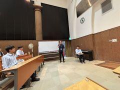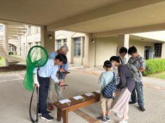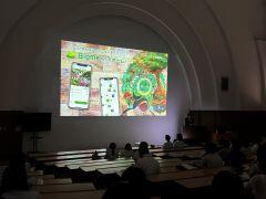 マルシェと並行して、生物探索アプリ「バイオーム」の体験会も実施しました。株式会社バイオームの中藤さんからアプリの使い方について説明していただいた後、科学部の生徒による案内のもと、生物を観察しながら校内を歩きました。とはいえ、昆虫などの動物はその場ですぐに見つけるのは難しいもの。そこで、科学部生物班は2日前から校内でさまざまな生きものを採集し、ケースに入れて通路沿いに並べておく工夫をしてくれました。参加者は、それらの生きものをスマートフォンで撮影し、アプリを使って名前を調べる体験を楽しみました。
