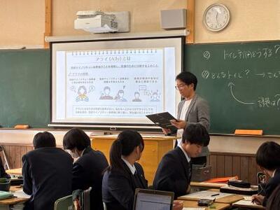 今回のテーマは、「多様な性」についてです。先週の人権講演会を受けて、自分たちの身近な社会の中の性のあり方について考えました。どんなセクシャリティの人も安心して生活できる環境にするために、特にトイレの問題についてディスカッションをしました。「みんなが使えるトイレとは?」について、生徒たちは積極的に意見を交わしあっていました。