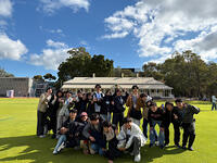 UWAのCrawley Campusの芝生で集合写真を撮りました。青く澄み渡る空の下、蒼く輝く絨毯のようでした。
