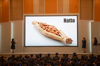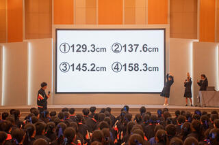 ② 日本の食と日本のアニメに関するクイズ 日本の食文化やアニメについてクイズを出しました。右の問題は何を聞いているかわかりますか?ドラえもんの身長です。選択肢を見せる前に答えた生徒がいて、驚きでした。タイでドラえもんはとても人気があるそうです。クイズ正解者には、日本のお菓子をプレゼントしました。