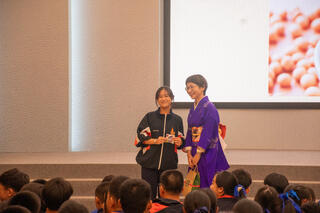 まず、チェンライ校の教頭先生からのご挨拶に続き、両校からのプレゼントが交換されました。チェンライ校からは、タイ北部の山岳民族のジャケットを頂きました。