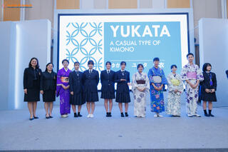 ④ 着物紹介 引率教員が着物について説明している間に、チェンライ校の生徒4名に浴衣を着てもらいました。祥雲館の生徒が着付けを担当しました。「女物だよ」と説明しても、「いいから、いいから」と男子生徒2人が参加してくれたのも場を和ませる一面でした。