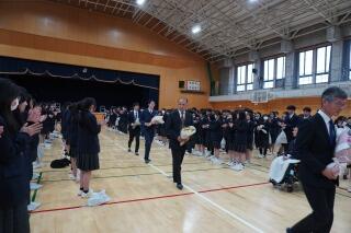 午後は離任式が行われました。この春,祥雲館高校から転勤・退職された先生方から,お別れのお話がありました。24回生の皆さんも,授業や部活動でお世話になった先生もおられると思います。