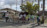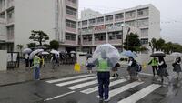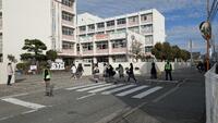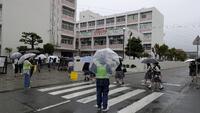 学校の前の道は車の通りが多いので自転車通学・電車通学の子供たちも気をつけながら通学出来ていました。