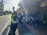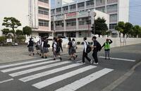 交通ルールは概ね守られていたと思います。ただ駅から歩いて登校時並列になっていますが、3人並ぶと道路側は危ないです。踏切付近斜め横断して先生に注意を受けていました。自転車の生徒も概ね交通ルールを守って通学していました。車の交通量も多く危ないです。善良な運転手さんは道を譲ってくれていましたが、そうでない人は我が道を行くって感じで危なかったです。挨拶はできていました。(Yさん記)