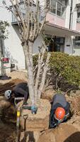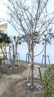 今年度の卒業寄贈品として玄関前の花壇に桜を植樹しました。学校の東側には天川沿いに綺麗な桜並木がありますが、校内には1本も桜の木がありませんでした。元々あった金木犀をずらして移植してもらいましたので、春には桜、秋には金木犀が咲きます。入学式に満開になりますようにハート