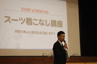 本日3限、体育館にて洋服の青山さんを講師にお迎えして、スーツの着こなしやマナー指導の講習を行いました。