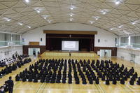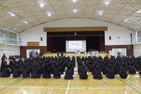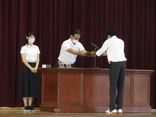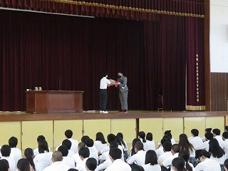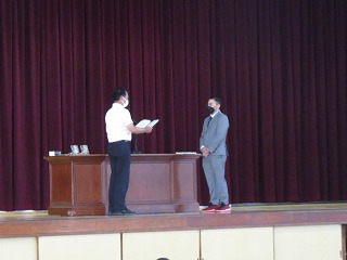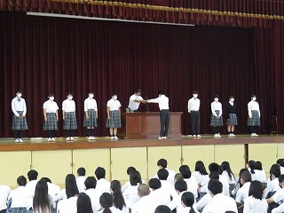 終業式の前に、離任式、表彰伝達式、生徒会認証式、全国大会出場者の壮行会を行いました。