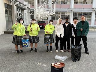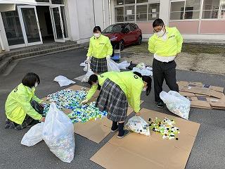 また、その前にはボランティア部で回収しているペットボトルキャップについて、ごみを取り除く作業を行いました。3年生の有志生徒も飛び込みで手伝ってくれ、短時間で終わらせることができました。