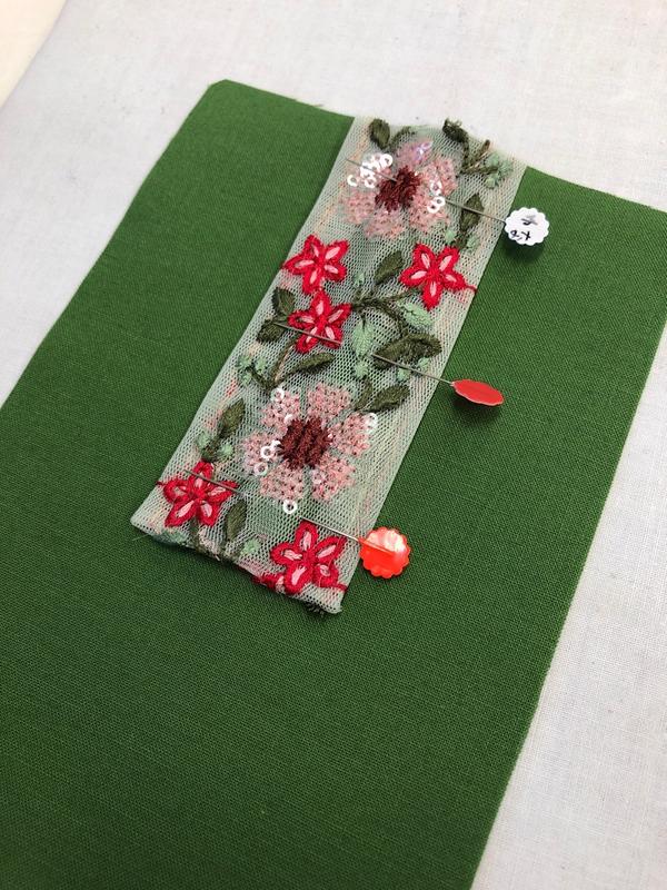 2週目は、インドの刺繍リボンを使って、がま口のポーチとリボンのヘアゴムを作る講座でした。一つの材料から二つの作品を作るという、経営にもつながるお話も聞くことができました。生徒も可愛い刺繍リボンを目にし、2時間という短い時間で2つの作品作りに集中して取り組むことができました。