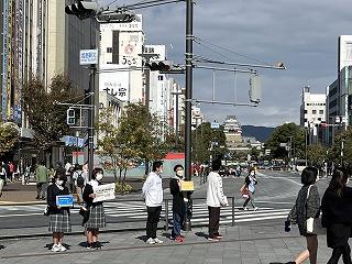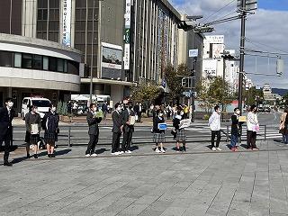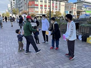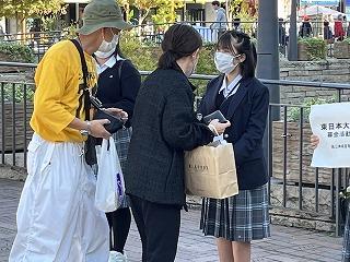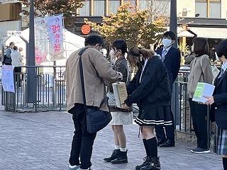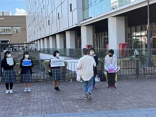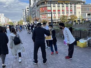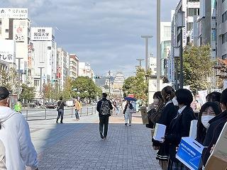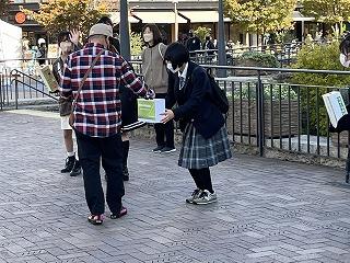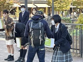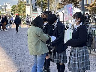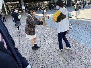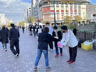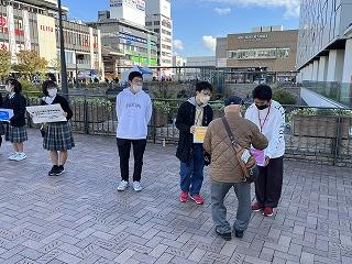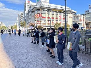 姫路駅前での実施は初めての経験であり、はじめは緊張していた生徒たちも、さまざまな人に声を掛けていただきながら、大きな声で呼びかけができるようになりました。