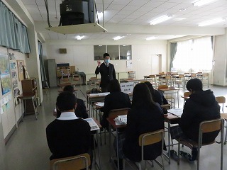 進学と就職に分かれ、進学希望者は進学の現状やオープンキャンパスの要点などを、就職希望者はミニ面接練習と求人票の見方を教えていただきました。