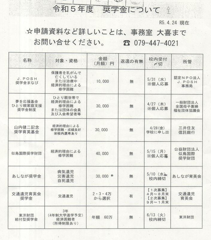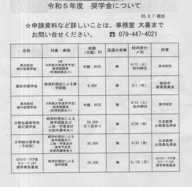 この制度は、高等学校(特別支援学校の高等部及び高等専門学校等)に在学し、経済的理由により就学困難な人に対して奨学金を支給するものであり、本市の発展に寄与する人材の育成、教育の機会均等を図ることを目的としています。高砂市奨学金.pdf