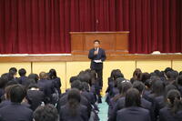 その後、終業式で校長先生と生徒指導部長から冬季休業中での行動について、「新聞を読みましょう」「マナーを守りましょう」などのお話をいただきました。