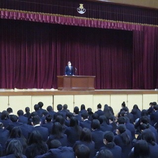 1/10 始業式の式辞で、校長先生から、「言葉の大切さ」についてお話がありました。それぞれの目標に向かって、ポジティブで前向きな言葉を浮かべて学生生活を送ってほしいと話されました。