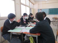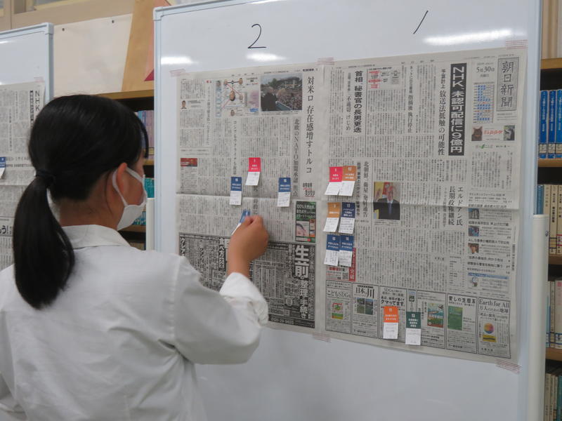 この写真はたくさんの共感を得たコメントを書いた生徒が発表している様子です。たくさんの付箋が貼ってある記事や、同じ記事でも違う付箋が貼られているものもありました。一つの問題の中に多くのSDGsの要素が絡んでいる。様々な視点が必要であることに気づけたようです。同じ記事のコメントでも生徒により違いがあり、生徒たちも真剣なまなざしでコメントをチェックしていました。来週からそれぞれが興味関心を持ったテーマに関してグループを組んで、探究活動を開始します。探究活動を通じてSDGsについて深く理解できるよう願っています。