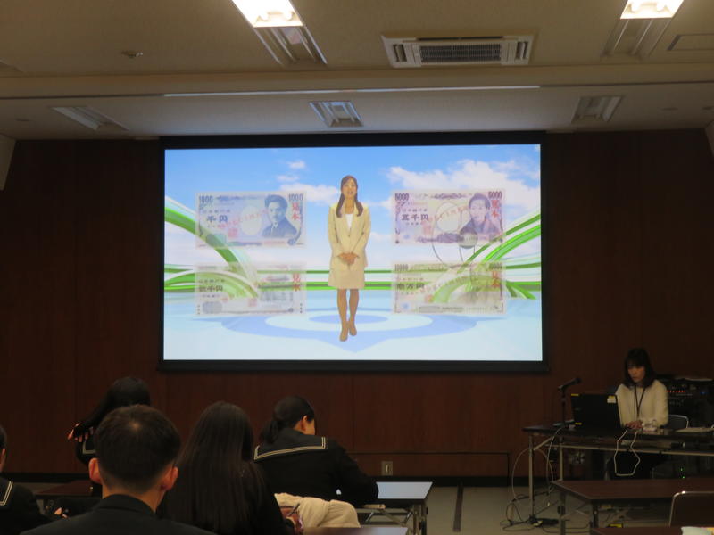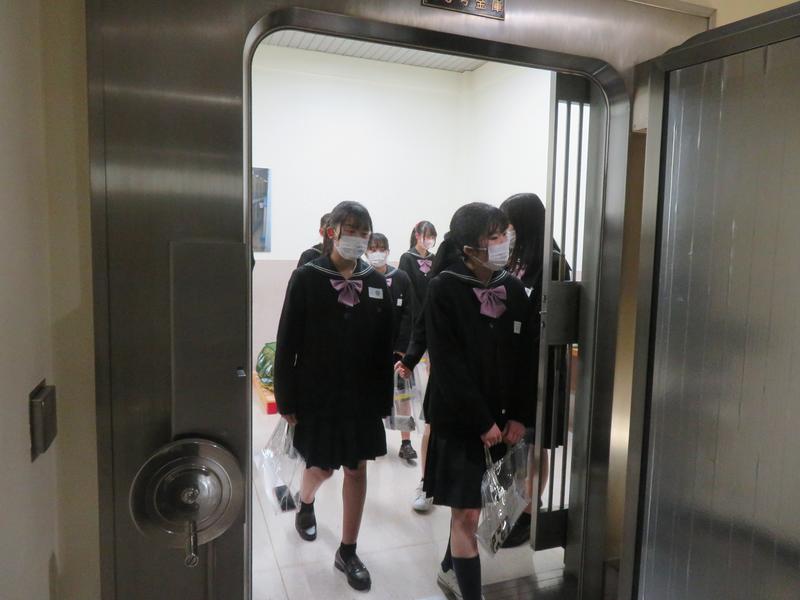 3月6日(木)の午後、日本銀行神戸支店へ校外学習に行きました。最初は普段なかなか入ることのできない施設に生徒たちは少し緊張気味・・・。最初に実際仕事をされている場所を見学させていただきました。その後は会議室で日本銀行の業務についてDVDで学びました。