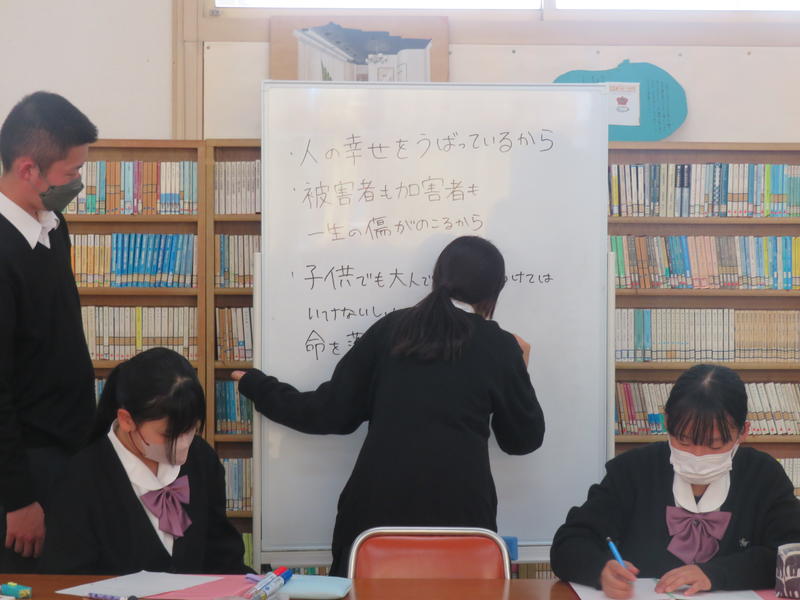 最後に生徒たちは、少しでもいじめを減らすにはどうすればいいかグループワークで考えていました。