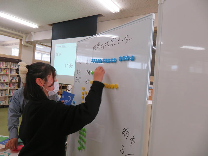 後半は、ファシリテーターからも全員が全体の様子をよく見て動けていたと誉めていただきました。ゲーム終了後の振り返りの時間では、SDGsについての気づきや考え方についてより深め、全体で共有をしました。発表者の人たちは感じたことや新たな気づきをしっかりと自分の言葉で表現できていました。これから本格的なSDGs探究活動が始まります。今日のゲームでは大きな学びがありました。今回の学びをこれからの探究活動に活かしていきましょう。