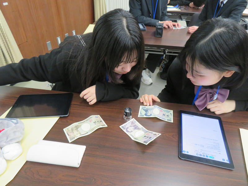 その後は行内の見学です。展示ルームでは、今までの日本銀行のあゆみや昨年発行された新札についての説明を受けました。説明後は体験タイムです。