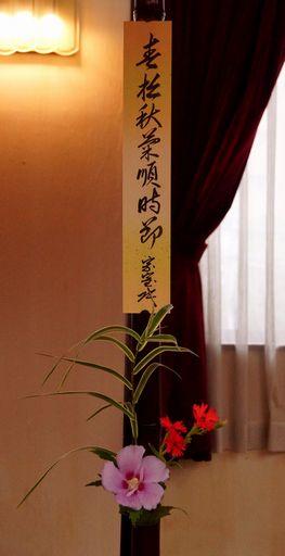 「春は松 秋は菊 ときはめぐる」の短冊と季節の花がお客さまをお迎えします。