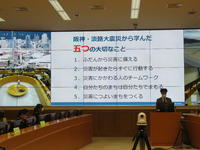 その後、災害対策本部室において防災についての講義を受けました。災害対策本部室は新型コロナ対策の会議などでも使用されており、ニュース等でもよく映っている場所です。それぞれの役割の席に座り会議の雰囲気を味わいました。阪神淡路大震災の状況を改めて知るとともに、現在の兵庫県の防災に対する取り組みについて多くのことを学ぶことができました。また、今後起こりうる災害に対して、自分たちがやらなければいけないことを考えることのできた充実した時間となりました。