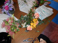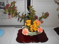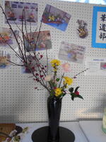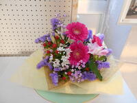 本日の新しい花材はアレンジメントが「ガーベラ、スターチス、ヒペリカム、カスミソウ、コワニー」で、写真上段のお瓶花(おへいか=深い花瓶にいけたもの)が「紅梅、キク、カーネーション」、盛り花が「トキワガマズミ、カーネーション、キク」です。