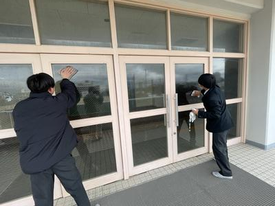 体育館入り口の扉ガラスをきれいに磨く2年生男子。