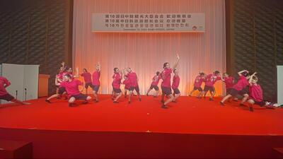 この舞台には3年生も出場してくれ、思いもかけず1~3年生までの全員でパフォーマンスをすることができました。部員たちは大喜び!日本・中国・韓国の3カ国の友好と未来に向けての熱いメッセージをパフォーマンスに込めました。