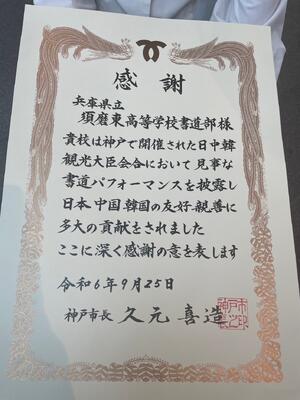 この度、本校書道部が「第10回日中韓観光大臣会合歓迎晩餐会」における書道パフォーマンス披露に対して、神戸市長より感謝状をいただきました。9月25日(水)には書道部部長と副部長が市役所を訪問し、神戸市長より直接感謝状を授与していただきました。